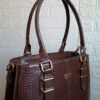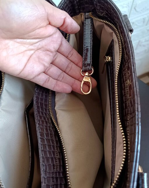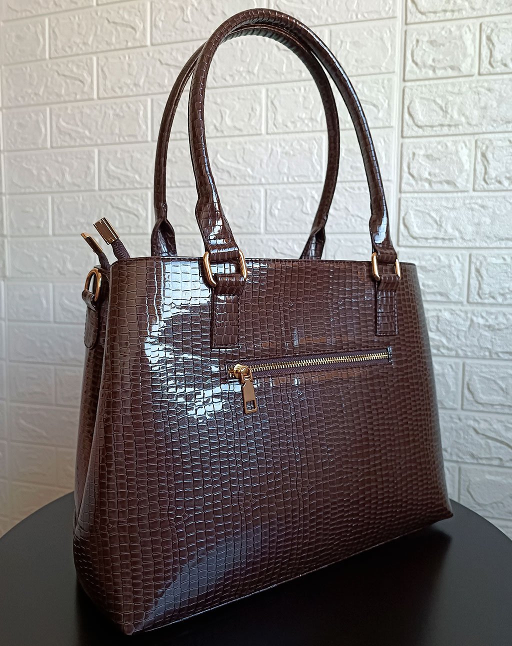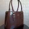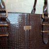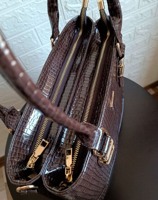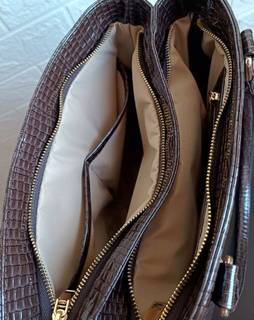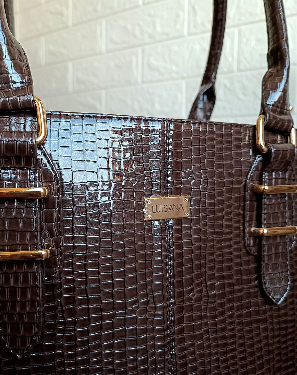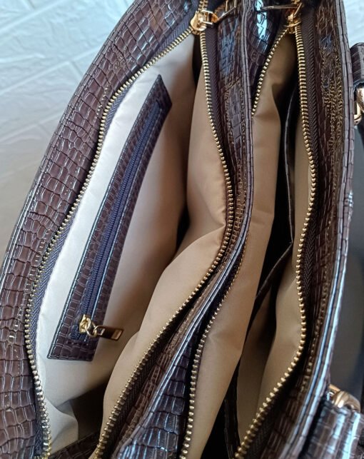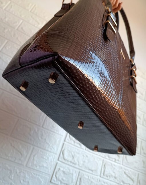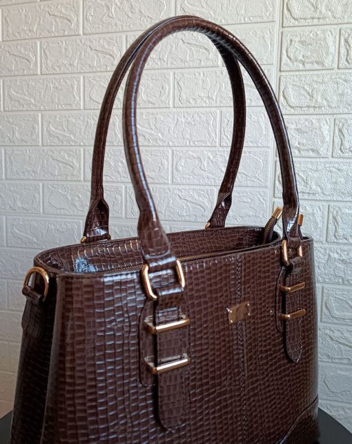 Su diseño rectangular y acabado croco charol lo convierten en tu compañera ideal.
