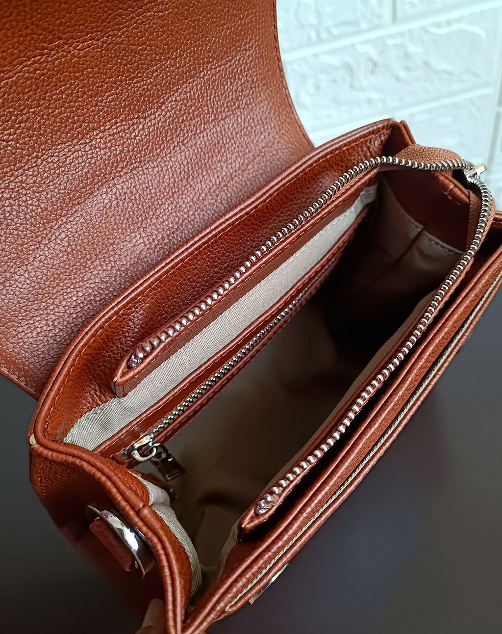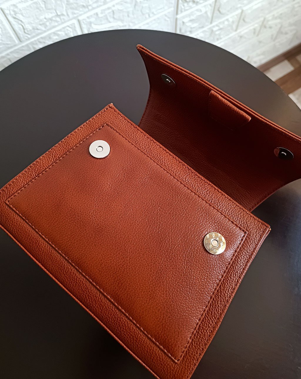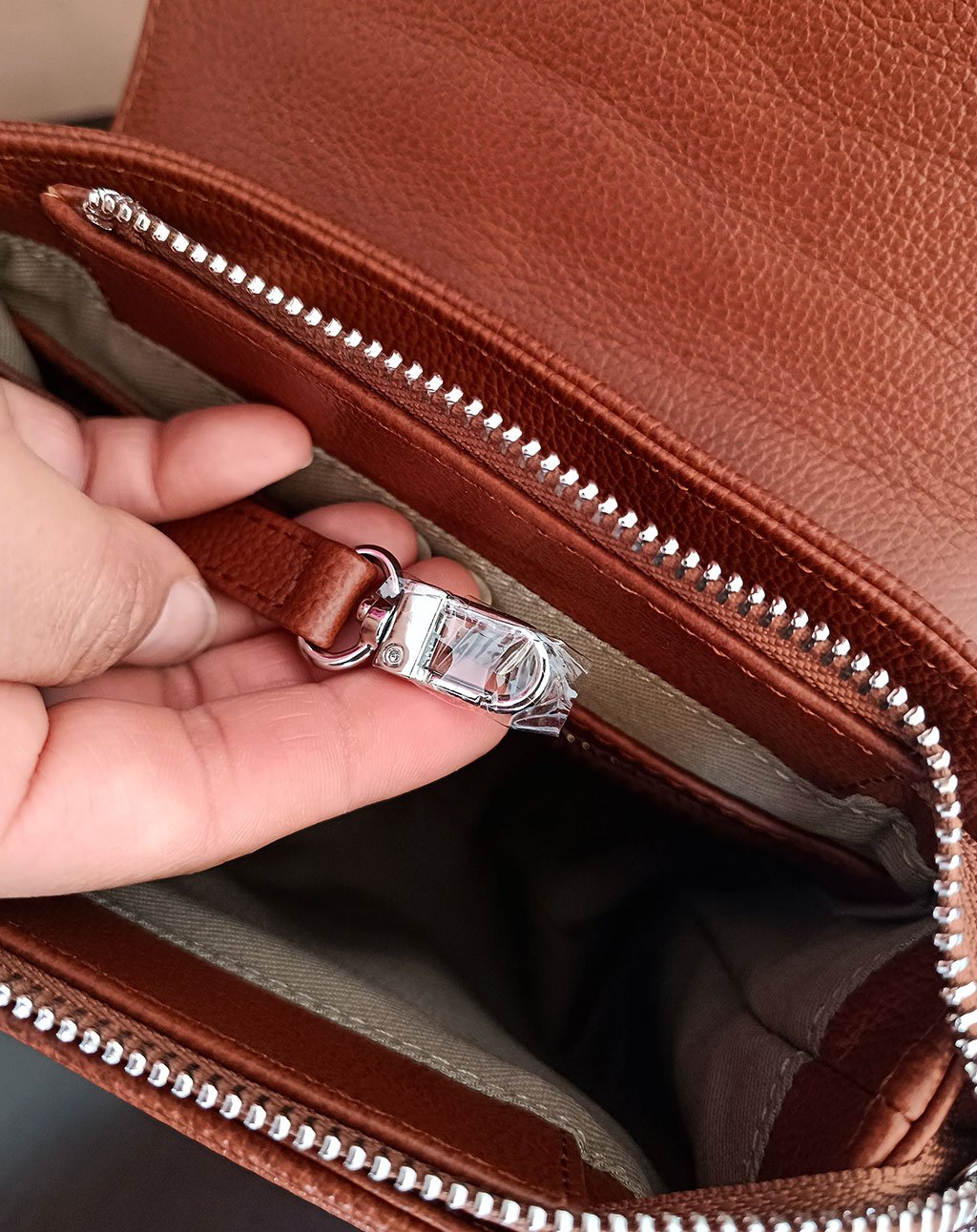 El bolso es una pieza artesanal, elaborado en cuero vacuno auténtico. El cuero contiene varias marcas naturales que pueden tener un aspecto diferente al de las fotos. Pueden aparecer como venas, estrías, diferencias de grano, inconsistencia en la superficie del cuero que es una característica única que valoramos.